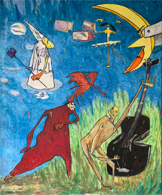 Перед вами — «Механический театр». Экспрессия, хаотичная динамика мазка, брызги красного и желтого. Разнонаправленные следы кисти, особенно заметные в пространстве пейзажа, побуждают кружить взглядом по всей плоскости холста. Зоо- и антропоморфные персонажи разыгрывают спектакль.